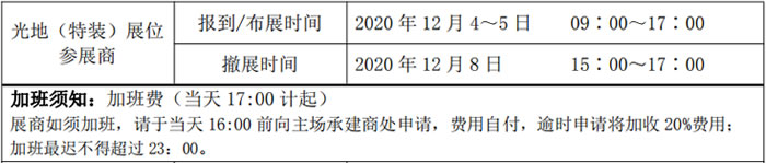 加班:展館方不接受各參展商單獨(dú)申請,如有加班,展商向所在區(qū)域的承建商申請,承建商向統(tǒng)籌科統(tǒng)一下單,由統(tǒng)籌科負(fù)責(zé)以工作單方式在16:00前通知客服中心相關(guān)部門,請憑單安排加班服務(wù),并對辦理加班手續(xù)的參展商及相關(guān)車輛給予放行。
