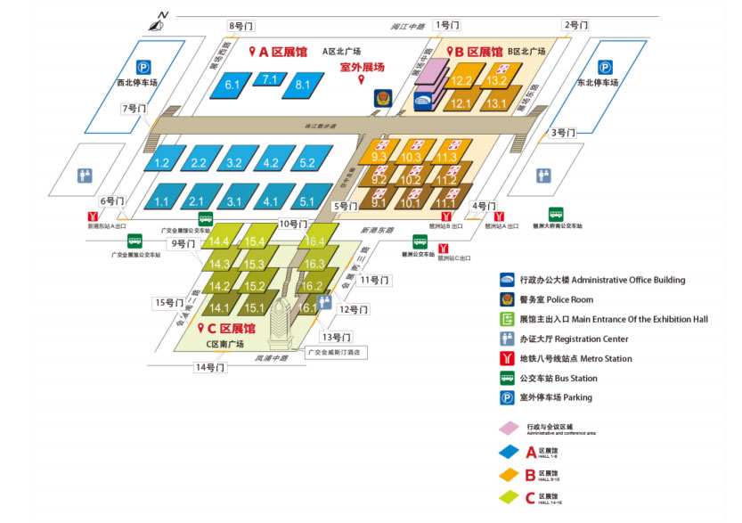 8號線到達(dá)新港東站,走A出口到達(dá)廣交會展館A區(qū)入口