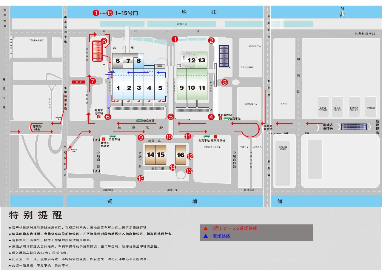 △市區(qū)內(nèi)可選擇經(jīng)廣州大橋、江灣大橋、海印橋至新港東路前往琶洲展館;或從廣園快 線、中山大道、黃埔大道經(jīng)科韻路、琶洲大橋前往琶洲展館。