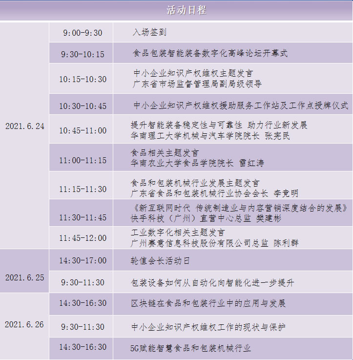 食品和包裝智能裝備數(shù)字化高峰論壇暨食包機協(xié)會輪值會長活動將于2021年6月24-26日在廣州·廣交會展館舉辦,本次活動聚焦食品行業(yè)變革升級、創(chuàng)新發(fā)展中面臨的挑戰(zhàn)和機遇,深度解析食品行業(yè)疫情之后發(fā)展的新趨勢,圍繞食品行業(yè)新生態(tài)體系的構建進行重點解讀和深入探討。論壇以促進食品行業(yè)健康發(fā)展為宗旨,關注食品行業(yè)發(fā)展新趨勢,探索行業(yè)數(shù)字化升級實施經驗,為行業(yè)搭造交流溝通、學習成長的平臺。