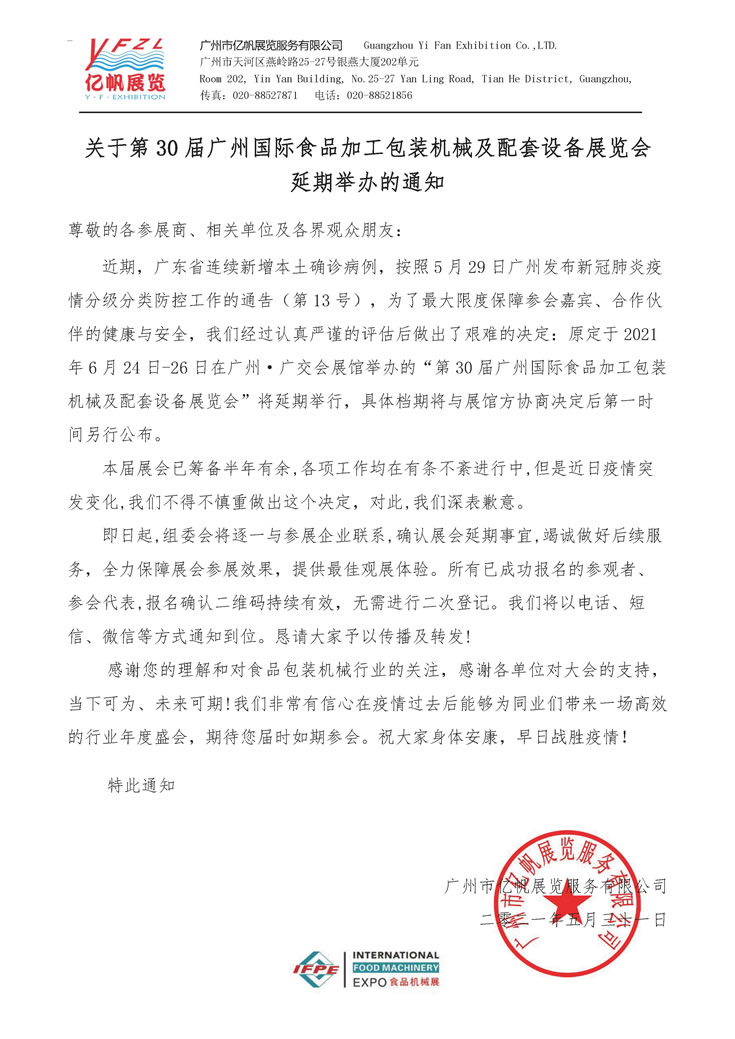 關(guān)于第30屆廣州國(guó)際食品加工包裝機(jī)械及配套設(shè)備展覽會(huì)延期舉辦通知