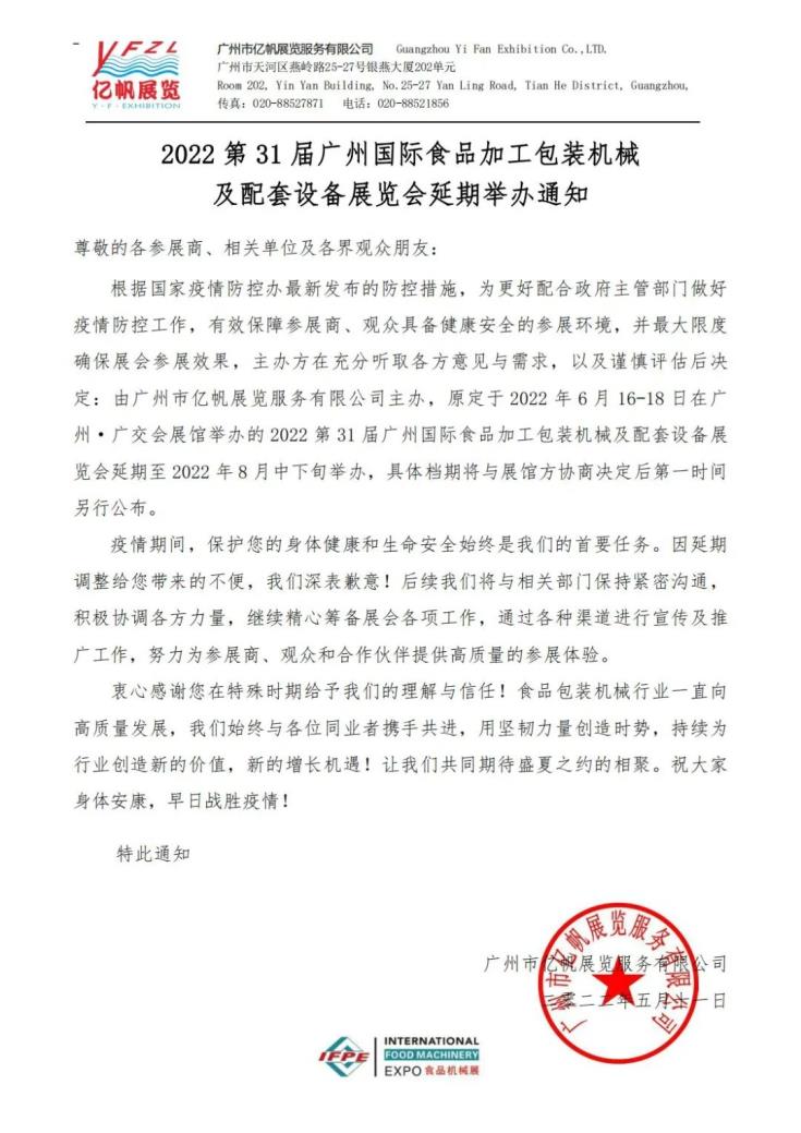 根據(jù)國(guó)家疫情防控辦最新發(fā)布的防控措施,為更好配合政府主管部門做好疫情防控工作,有效保障參展商、觀眾具備健康安全的參展環(huán)境,并最大限度確保展會(huì)參展效果,主辦方在充分聽取各方意見與需求,以及謹(jǐn)慎評(píng)估后決定:由廣州市億帆展覽服務(wù)有限公司主辦,原定于2022年6月16-18日在廣州·廣交會(huì)展館舉辦的2022第31屆廣州國(guó)際食品加工包裝機(jī)械及配套設(shè)備展覽會(huì)延期至2022年8月中下旬舉辦,具體檔期將與展館方協(xié)商決定后第一時(shí)間另行公布。