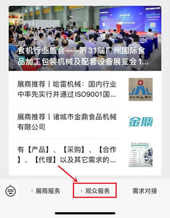 2、關(guān)注微信公眾號(hào)“IFPE食機(jī)展”,點(diǎn)擊菜單欄“觀眾服務(wù)”下的“參觀報(bào)名”,按照步驟填寫(xiě)即可。