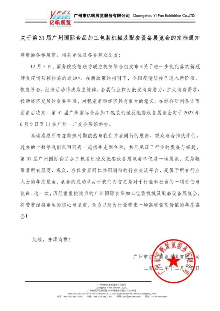 12月7日,國務(wù)院疫情聯(lián)防聯(lián)控機制綜合組發(fā)布《關(guān)于進一步優(yōu)化落實新冠肺炎疫情防控措施的通知》。在新政策的指引下,全國疫情防控已進入新階段,恢復(fù)社會、經(jīng)濟活動將成為主旋律。會展行業(yè)作為激發(fā)消費潛力、擴大消費需求、拉動經(jīng)濟發(fā)展的重要手段,對穩(wěn)定市場經(jīng)濟具有重大的意義。在綜合研判各方面因素后決定:第31屆廣州國際食品加工包裝機械及配套設(shè)備展覽會定于2023年6月9日至11在廣州·廣交會展館舉辦。