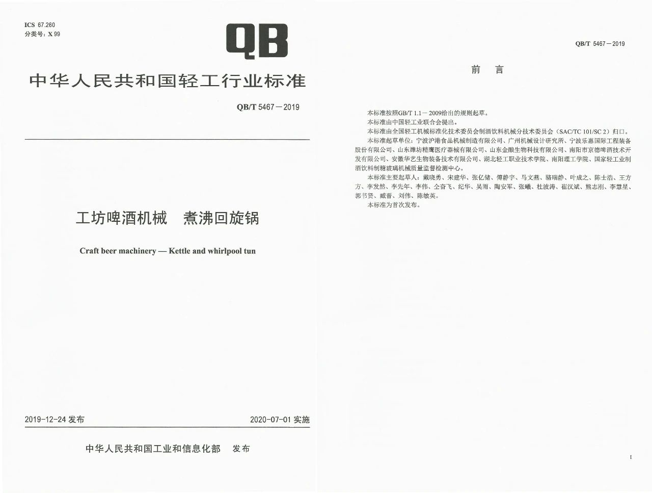 中華人民共和國工業(yè)和信息化部公告2020年第114號文,由我標(biāo)委會歸口,寧波滬港食品機(jī)械制造有限公司牽頭起草的QB/T 5466-2019《工坊啤酒機(jī)械 糖化過濾鍋》和QB/T 5467-2019 《工坊啤酒機(jī)械 煮沸過濾鍋》2項(xiàng)行業(yè)標(biāo)準(zhǔn)已于2020年7月1日正式實(shí)施。