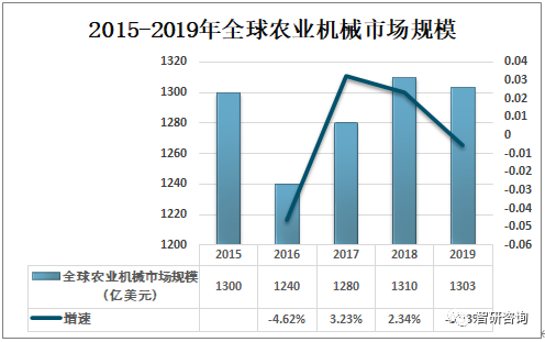 農(nóng)業(yè)是國民經(jīng)濟(jì)的基礎(chǔ),農(nóng)業(yè)生產(chǎn)力水平的高低直接影響著國民經(jīng)濟(jì)的發(fā)展,而農(nóng)業(yè)機(jī)械化程度則成為了當(dāng)今社會衡量國家農(nóng)業(yè)發(fā)展水平的一個重要標(biāo)志。2018年全球農(nóng)業(yè)機(jī)械市場規(guī)模為1310億美元,較2017年同比增長2.34%;2019年全球農(nóng)業(yè)機(jī)械市場規(guī)模為1303億美元,較2018年同比下降0.53%。
