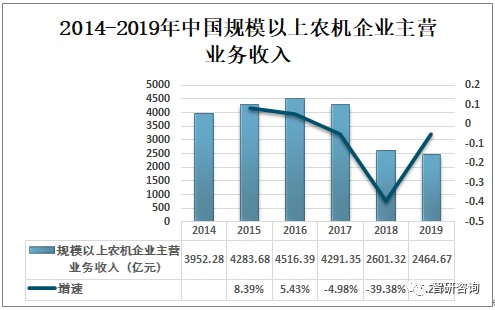 改革開放以后,中國的農(nóng)機(jī)技術(shù)不斷與世界先進(jìn)技術(shù)接軌,不斷汲取世界先進(jìn)技術(shù),因此中國農(nóng)機(jī)行業(yè)得到快速發(fā)展。2018年中國規(guī)模以上農(nóng)機(jī)企業(yè)主營業(yè)務(wù)收入為2601.32億元,較2017年同比下降39.38%;2019年中國規(guī)模以上農(nóng)機(jī)企業(yè)主營業(yè)務(wù)收入為2464.67億元,同比下降5.25%。