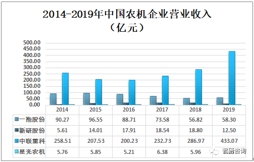 2018年一拖股份、新研股份、中聯(lián)重科及星光農(nóng)機(jī)營業(yè)收入分別為56.82億元、18.80億元、286.97億元、5.96億元;2019年一拖股份、新研股份、中聯(lián)重科及星光農(nóng)機(jī)營業(yè)收入分別為58.30億元、12.50億元、433.07億元、7.05億元。