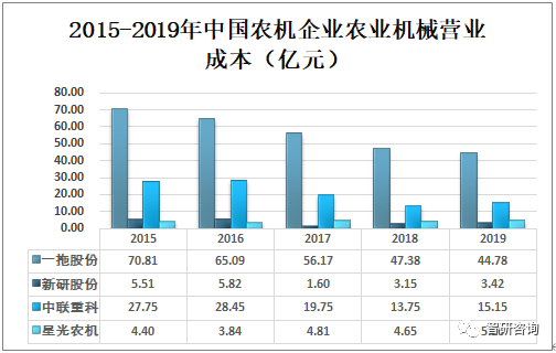 2019年一拖股份、新研股份、中聯(lián)重科及星光農(nóng)機(jī)農(nóng)業(yè)機(jī)械營業(yè)成本分別為44.78億元、3.42億元、15.15億元、5.26億元。