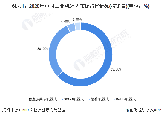 據(jù)MIR統(tǒng)計(jì),2020年垂直多關(guān)節(jié)機(jī)器人在中國市場中的銷量在各機(jī)型中依然位居首位,全年銷售總銷量的63%;SCARA機(jī)器人全年銷售占比為30%;另外,協(xié)作機(jī)器人與Delta機(jī)器人銷售占比分別為4%與3%。