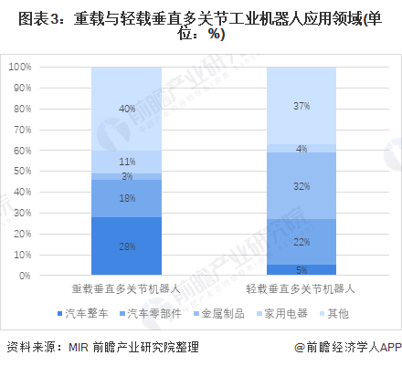 在垂直多關(guān)節(jié)機(jī)器人應(yīng)用領(lǐng)域方面,重載垂直多關(guān)節(jié)機(jī)器人與輕載垂直多關(guān)節(jié)機(jī)器人均在汽車領(lǐng)域使用較多,其中能夠更多重量的重載垂直多關(guān)節(jié)機(jī)器人主要應(yīng)用于汽車整車制造,應(yīng)用比例約為28%;輕載垂直多關(guān)節(jié)機(jī)器人則主要應(yīng)用于汽車零部件領(lǐng)域,應(yīng)用比例約為22%。