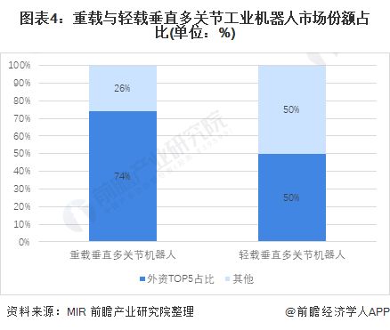 注:重載垂直多關(guān)節(jié)機(jī)器人中TOP5外資分別是發(fā)那科、安川電機(jī)、庫卡、川崎與ABB;輕載垂直多關(guān)節(jié)機(jī)器人中TOP5外資分別是發(fā)那科、ABB、安川電機(jī)、那智不二越與庫卡。