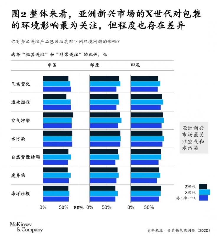 當(dāng)深入研究第二個(gè)問題,探究是哪個(gè)群體在助推這些擔(dān)憂時(shí),我們發(fā)現(xiàn)所有受訪年齡群體都很關(guān)注這些問題。整體來看,X世代的關(guān)注程度最高,其次是Z世代/千禧一代和嬰兒潮一代(見圖2)。具體到空氣和水污染這兩個(gè)主要領(lǐng)域,印尼的X世代對此尤其關(guān)注,而中國和印度的情況差異較大。