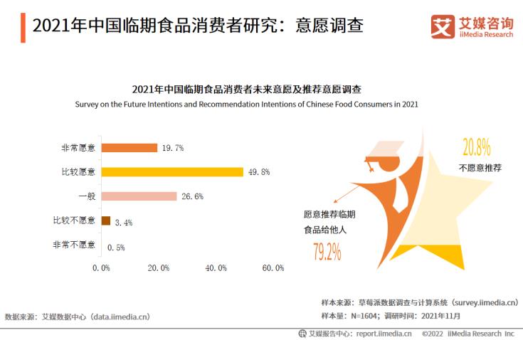 數(shù)據(jù)顯示,有69.5%的中國(guó)臨期食品消費(fèi)者表示,未來愿意繼續(xù)購(gòu)買;近八成的臨期食品消費(fèi)者表示愿意向他人推薦。艾媒咨詢分析師認(rèn)為,中國(guó)臨期食品消費(fèi)者對(duì)臨期食品的消費(fèi)意愿較為強(qiáng)烈,高性價(jià)比的特點(diǎn)吸引消費(fèi)者進(jìn)行消費(fèi),并且愿意向他人推薦此類高性價(jià)比的產(chǎn)品。