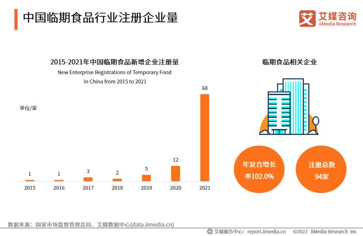 數(shù)據(jù)顯示,截至2021年,我國(guó)臨期食品相關(guān)企業(yè)總注冊(cè)量達(dá)94家,市場(chǎng)競(jìng)爭(zhēng)加劇。2021年臨期食品行業(yè)企業(yè)注冊(cè)量激增,遠(yuǎn)多于往年新注冊(cè)企業(yè)數(shù)量。