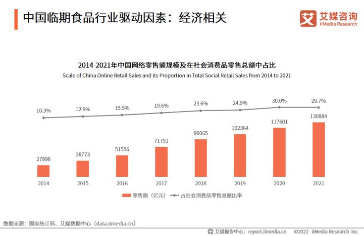 數(shù)據(jù)顯示,中國(guó)網(wǎng)絡(luò)零售額規(guī)模持續(xù)擴(kuò)大,2021年達(dá)130884億元,占社會(huì)消費(fèi)品零售總額近三成。艾媒咨詢分析師認(rèn)為,線下店鋪受到疫情沖擊,線上消費(fèi)已經(jīng)成為大部分消費(fèi)者的選擇,線上零售市場(chǎng)持續(xù)擴(kuò)大,成為臨期食品主流銷售渠道,為臨期食品線上市場(chǎng)消費(fèi)提供良好的消費(fèi)基礎(chǔ)。