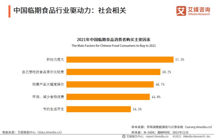 數(shù)據(jù)顯示,中國(guó)臨期食品被購(gòu)買的前三大因素是:折扣力度大(57.3%)、食品原價(jià)較貴(50.2%)、剛需產(chǎn)品大幅降價(jià)(46.7%)。艾媒咨詢分析師認(rèn)為,年輕消費(fèi)群體成為臨期食品主要消費(fèi)群體,并且低價(jià)、折扣大、實(shí)惠等理念滲透到年輕消費(fèi)群體,臨期食品市場(chǎng)需求進(jìn)一步擴(kuò)大,推動(dòng)市場(chǎng)發(fā)展。