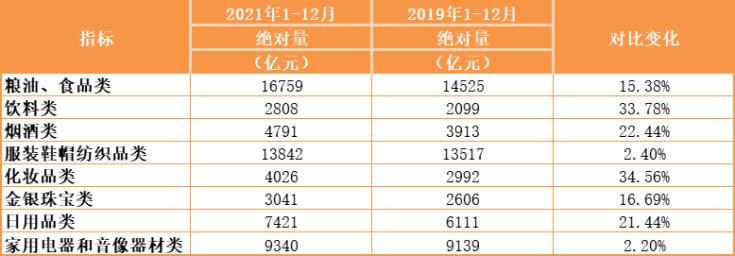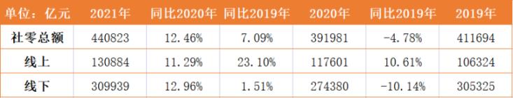 線上、線下方面,2021年線上消費(fèi)額較2020年增速同比提升11.29%,較2019年大增23.1%,可見(jiàn)隨著疫情的爆發(fā)及常態(tài)化趨勢(shì),線上消費(fèi)習(xí)慣進(jìn)一步普及與深化;但線下消費(fèi)則不太樂(lè)觀,2021年相較2019年僅微增1.51%,基本持平。
