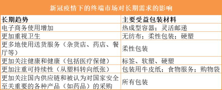 因?yàn)橄M(fèi)結(jié)構(gòu)的變化,導(dǎo)致終端消費(fèi)市場(chǎng)對(duì)包裝也產(chǎn)生了直接影響。麥肯錫調(diào)查了美國(guó)疫情下的終端市場(chǎng)對(duì)長(zhǎng)期需求的影響。疫情加速讓全球轉(zhuǎn)向電子商務(wù),也推動(dòng)了包裝尺寸的變化,消費(fèi)者對(duì)包裝和廢棄物的感知,以及更便利的包裝設(shè)計(jì)。