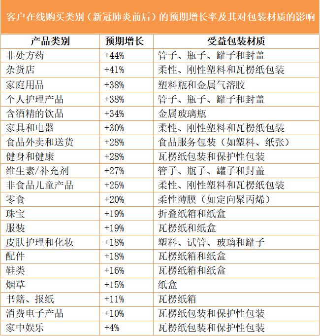 預(yù)計(jì)幾乎所有消費(fèi)品類別都將實(shí)現(xiàn)線上購(gòu)買的持續(xù)增長(zhǎng),特別是非處方藥、日用商品、家庭用品和個(gè)人護(hù)理產(chǎn)品。下圖顯示了麥肯錫和Mesirow基于美國(guó)消費(fèi)者的數(shù)據(jù),這些包裝形式有望受益最大,包括瓦楞運(yùn)輸紙箱、其他形式的保護(hù)性包裝、柔性薄膜、硬質(zhì)容器、塑料瓶和塑料管、金屬氣霧罐和罐子。