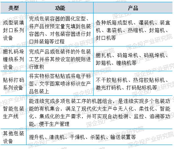 食品包裝機(jī)械包含了食品加工制造機(jī)械和包裝設(shè)備,其中食品機(jī)械主要可分為液態(tài)包裝及乳制品裝備、釀酒裝備、肉類加工裝備、飲料裝備、烘焙糖制品裝備、調(diào)味品裝備、食品安全檢測(cè)裝備等類別。包裝是商品進(jìn)入流通領(lǐng)域的必要條件,而包裝設(shè)備是實(shí)現(xiàn)產(chǎn)品包裝的主要手段。按照工序劃分,包裝設(shè)備可以劃分為成型裝填封口系列設(shè)備、捆扎碼垛纏繞系列設(shè)備、貼標(biāo)打碼系列設(shè)備、智能包裝生產(chǎn)線及其他設(shè)備五類,如下表所示。